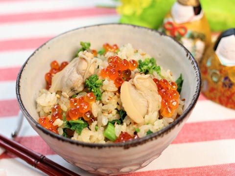 はまぐりの茹で汁で炊いたごはんに、いくらや菜の花で華やかに☆