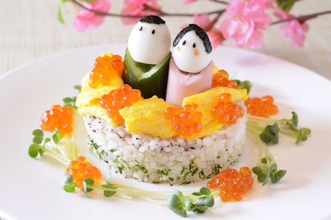 同じく歓声があがりそうな「おひな様とお内裏様の3色押し寿司」