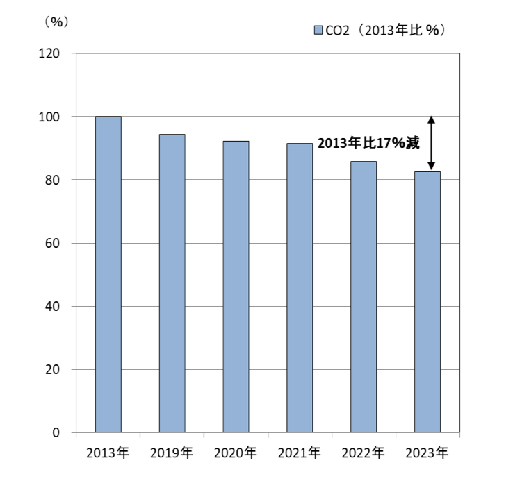 地球温暖化防止は人類共通の課題です。当社では地球温暖化の原因となるCO2排出量の削減のため、省エネルギーや燃料転換に積極的に取り組んでおり、組織的な省エネルギー活動や、A重油からLNGへの燃料転換を進めています。2023年の本社工場でのエネルギー使用に伴うCO2排出量は、2013年比で17%減少しました。