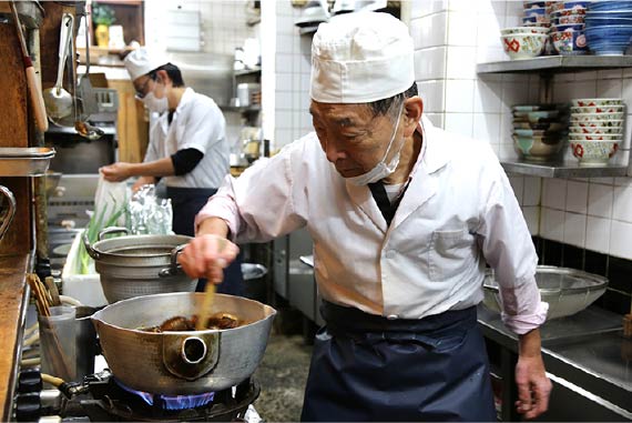 大阪では、うどんのかけだしも、つけだしも同じく「だし」と言います。昆布は、真昆布、利尻昆布など、状況に合わせて使い勝手の良いものを選び、一晩水に浸けておきます。それを火にかけて沸騰したら差し水をして一旦温度を下げたところに削り節をいれます。本節、亀節、宗田節、笹目近、寒目近、鯖節など数種類の節を粉状にして使います。四代目の聖司さんは手酌で丁寧にだしを仕上げていきます。容器の上に、竹ざると漉し布をのせ、砂糖、塩を置き、煮立っただしをかけて漉す作業は、簡略化がよしとされる時代に一見逆行しているかのようです。が、100年近く受け継がれる材料や手順によって、大阪人が愛してやまない大阪だしうどんの要が技術継承されているのです。