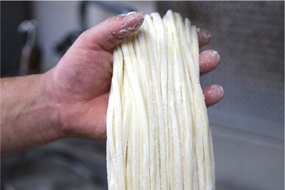 毎朝、1.4キロずつにまとめたうどんの生地を足で踏み、熟成なしでのばし、切ります。麺の長さは45㎝ほど。長すぎない大阪人好みのちょうど良い長さ。