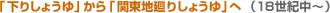 17世紀から18世紀にかけて、大阪、ついで江戸が大市場として成長してきます。すでに菱垣廻船や樽廻船という定期船が大阪と江戸を結び、評判の高い上方のしょうゆも江戸に運ばれ、「下りしょうゆ」として名声を博しました。この頃はしょうゆに限らず、酒でも菓子でも上方から下ってくる「下りもの」は高級品、江戸周辺の産物は「下らない」もの、つまり下級品ということになっていました。 |
