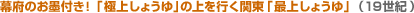 銚子と野田の造醤油業者はこれで力を得、「関西が極上なら関東はその上を行く最上!」が絶好の宣伝文句になり、以後、関東こいくちしょうゆが全国の市場を制覇していくことになるのです。 |