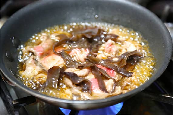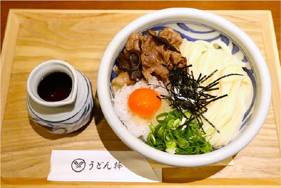 小麦粉はさぬきの夢がメイン。仕上げは讃岐牛とキクラゲをさっと火入れ。卵黄をくずして甘辛い牛肉にからませ、鬼おろし、青葱、海苔と 一 緒に麺と交互に運ぶと、おいしさと爽やかさで自然に笑みがこぼれます。