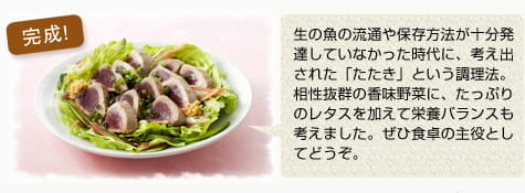 濃厚なたれとかつおを合わせて、たっぷりの香味野菜と一緒にいただきます。にんにくの香りが食欲をそそります。 |