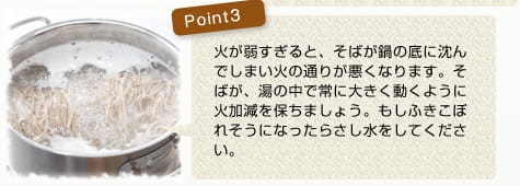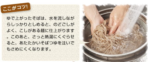 大きめの鍋にたっぷりの湯を沸かしてそばを広げるようにして入れ、湯の中に沈んだら菜箸で大きく混ぜる。