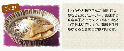 そばがゆで上がったらざるに上げ、たっぷりの流水で洗ってぬめりを取り、さっと熱湯にくぐらせ水けをよくきって器に盛る。STEP2のそばつゆを注いでSTEP1の油揚げをのせ、白髪ねぎ、ゆずの皮を添える。