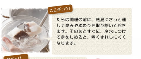 ![]() ![]() ![]() たらの切り身は3等分に切る。たっぷりの熱湯に入れ、表面の色が変わったら冷水にとる。