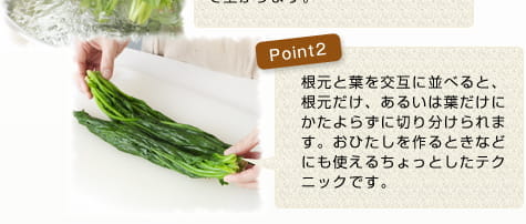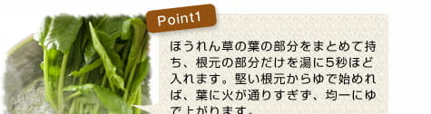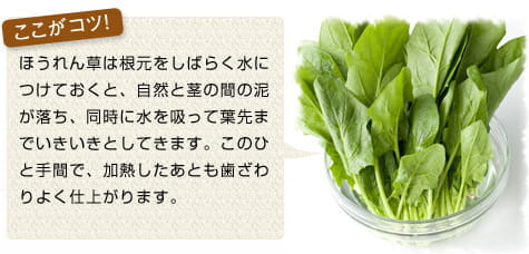![]() ![]() ![]() ほうれん草は、あれば根を切り、茎の根元に浅く切りこみを入れる。根元をたっぷりの水につけ、10分ほどおく。