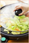 ホットプレートについている「ふた」。使っていますか? ホットプレートのレパートリーを増やしたいなら、ふたをした蒸し焼き、蒸し炒めがおすすめ。蒸気を逃さないので熱効率がアップし、短い時間で調理することができます。材料は大きさを揃えて切ると火の通る時間に差がでません。