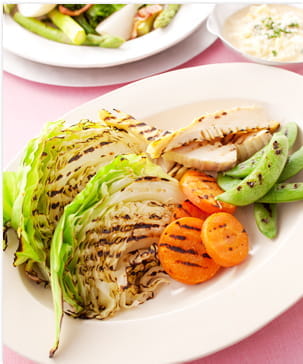 野菜の焼き加減のコツは焼きすぎないこと。歯触りを残すように焼きましょう。野菜の甘みを引き立てるヤマサ昆布ぽん酢と香味野菜をたっぷり加えたドレッシングで香ばしく焼けたさわらと野菜を一緒にいただきましょう。