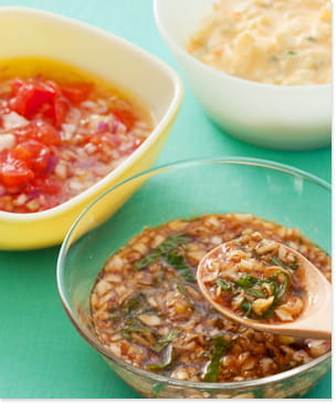 シンプルなサラダには、野菜を混ぜた手作りドレッシングを合わせてみませんか。野菜の摂取量が増やせるだけでなく、味のバリエーションが広がって、毎日でも飽きずに食べられます。例えば、刻んだきゅうりを混ぜたタルタルソースは、ゆで野菜にぴったり。ディップ感覚でいただけます。