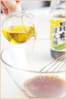 ドレッシングの基本は、酢+塩+油。まず酢に塩を加えて混ぜ溶かしてから、油を少しずつ混ぜると、失敗しません。酢と塩の替わりに「ぽん酢」を使えば、手軽に和風ドレッシングが完成。昆布のうまみをきかせたタイプのものなら、さらにまろやかになりおいしさもアップしますよ。