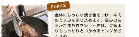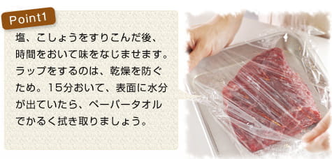 ![]() ![]() ![]() 牛もも肉は冷蔵庫から出して、室温に30分ほどおく。塩、こしょうを全体にすりこみ、