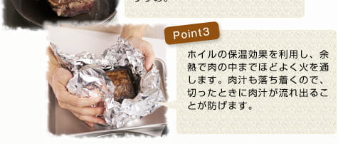 ステーキ肉は下味をつけたらすぐに焼き始めましょう。まな板に置いてすぐに切ると、旨みの肉汁が流れ出てしまいます。少しおくことで、肉汁が落ち着き旨みが戻ります。ソースの生姜はお好みで加減しましょう。 |