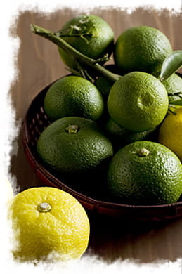 収穫時期は長いのですが、8〜9月に収穫するものは青柚子、収穫が進み11月以降のものは黄柚子と呼んでいます。皆さんが鍋によく使うぽん酢は、柚子やカボス、すだちを絞って酢の代わりに江戸時代から 使われていたそうですが、語源はオランダ語の柑橘類の果汁を意味するPONS(ぽんす)が変化し、すが酢になってポン酢となったそうです。