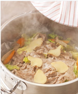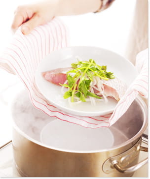 数種類の素材をいっしょに蒸すときは、火の通りやすい野菜を入れ、その上に肉・魚介などを重ねます。香味野菜や酒などの調味料は最後に加えて。こうすると、味や香りが全体に行きわたり、おいしく仕上がります。蒸し料理は、加熱後も香りが残る調理法でもあるのです。