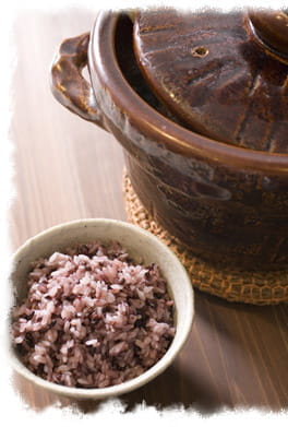 赤米はビタミン、ミネラルたっぷりと栄養面でも優れていて、古くからお祝いの席や記念日に食べられることからお赤飯の起源と考えられています。その赤米の色は炊き上がるとピンク色に染まります。タンニンという赤色系色素、ポリフェノールの一種である事から健康食品として見直されています。