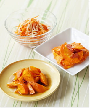 小鉢メニューを作るとき、にんじん、れんこん、じゃがいもなどの根菜は、よく洗って皮ごと使ってみてください。野菜のうまみは、皮と身のあいだにあるといわれています。シンプルな味つけのメニューほど、野菜の持ち味が引き立ちます。