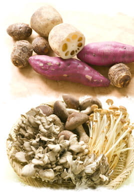 秋の味覚の代表格のレンコンやごぼう、お芋、きのこ。
