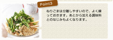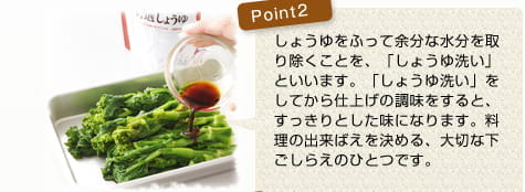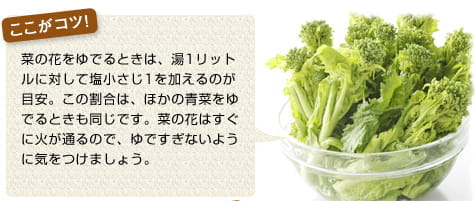 ![]() 鍋に湯を沸かし、塩を加える。菜の花の葉先を持ち、茎を10秒ほど湯につけてから、箸で全体を沈めながら20秒ほどゆでる。冷水に取ってさまし、水気をかるくしぼる。