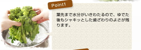 ![]() ![]() ![]() 菜の花は茎の固い部分を1cmほど切り落とす。