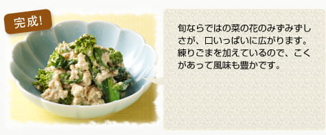 菜の花はゆでてから軽く炒めてパスタと合わせます。歯ごたえと菜の花のほろ苦さをヤマサ昆布つゆ白だしがまろやかにまとめます。 |