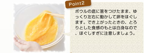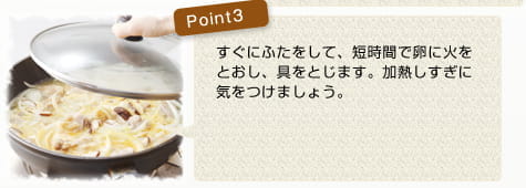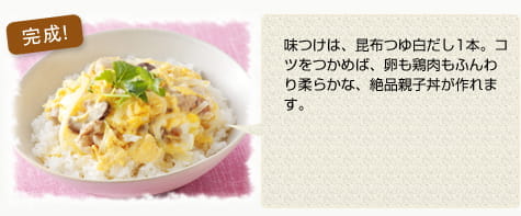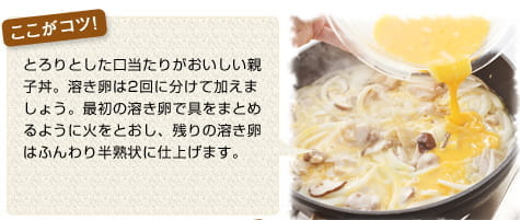 汁にとろみをつけてから卵をまわし入れるとふんわりとした卵に仕上がります。最後に生姜をお好みの量加えていただきます。 |