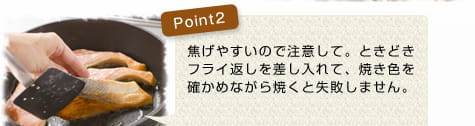 ![]() フライパンにサラダ油を中火で熱し、Step1に小麦粉を薄くまぶし、盛りつけるとき上になるほうを下にして入れる。