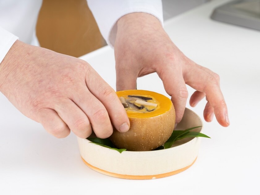 野村様:トマトやアボカドなど、もともとは西洋食材であっても受け入れられて日本料理の定番食材になったものがあります。日本の食文化はなんでも上手に取り入れる柔軟性がありますね。精進料理には「こういうものだろう」という固まったイメージがありますが、僕はそれを取り払って、ワクワクするような華やかさや楽しさのある料理を提供したいと思っています。目指しているのは、精進料理ではあるけれどコテコテの精進料理ではないもの。「匠の皿」のメニューに使ったバターナッツのような西洋の食材は、僕の料理の可能性や料理の幅を広げる存在です。海外で、その土地の食材で料理をする機会も多いのですが、野菜が主体の精進料理は意外と国を選ばないんですよ。「日本でこの食材を使ってみよう」とメニュー開発のヒントになることも多々あります。ただし、口にした時に「日本料理じゃない」と思われるような料理にはしたくありません。あくまで着地点は日本料理として、バランスをとるようにしています。