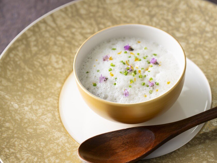 今の時代、フランス料理でも伝統的なものよりも軽めの料理が求められています。煮詰めて作る出汁だと、やっぱり少し強い印象になってしまう。日本料理と西洋料理の出汁を組み合わせてちょうどよい軽さを出すのは、今の時代にフィットしているでしょう。ただし、昆布出汁と鰹出汁を合わせてしまうと、完全に日本料理になってしまう。だから私が今回開発したメニューでは、グルタミン酸を含む昆布の出汁とイノシン酸を含む鶏の出汁を合わせて使いました。日本人が日本人のために作るフレンチですから、日本料理の出汁を加えることによって食べる人に安らぎを感じていただけるのではないかと思っています。