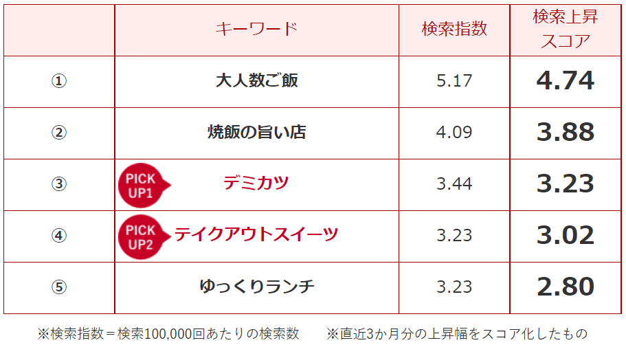 大手ハンバーガーチェーンが「デミカツチキンバーガー」を発売したり、回転寿司の全国チェーンが関西限定で、「マグロデミカツすし」を発売したりしたことで、外食ユーザーを中心に検索が伸びました。直近のぐるなび検索指数では、3年前の同時期と比べて約8倍の検索数にまで増えています。