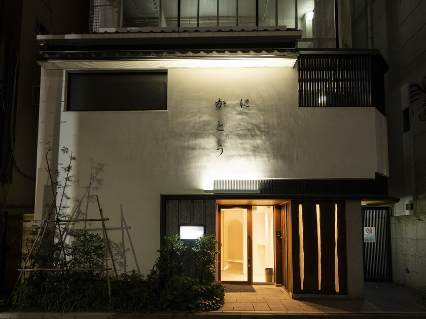 国内外から訪れる多くの観光客でにぎわう浅草。しかし、吾妻橋のたもとから墨田川沿いに伸びる通りには、別の空間に入り込んでしまったような静けさが漂います。この通りに2023年4月、「かにかとう」はオープンしました。扉を開け、雪のトンネルのような純白のアプローチを進むと、浮世を離れて未知なる食の世界に入っていくような感覚に。ここから既に、「かにかとう」のプレゼンテーションは始まっているのです。