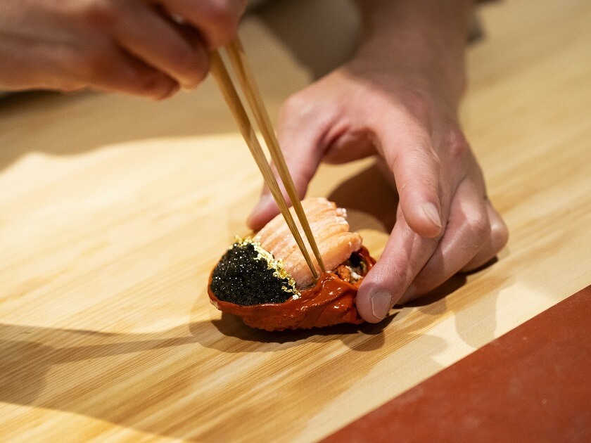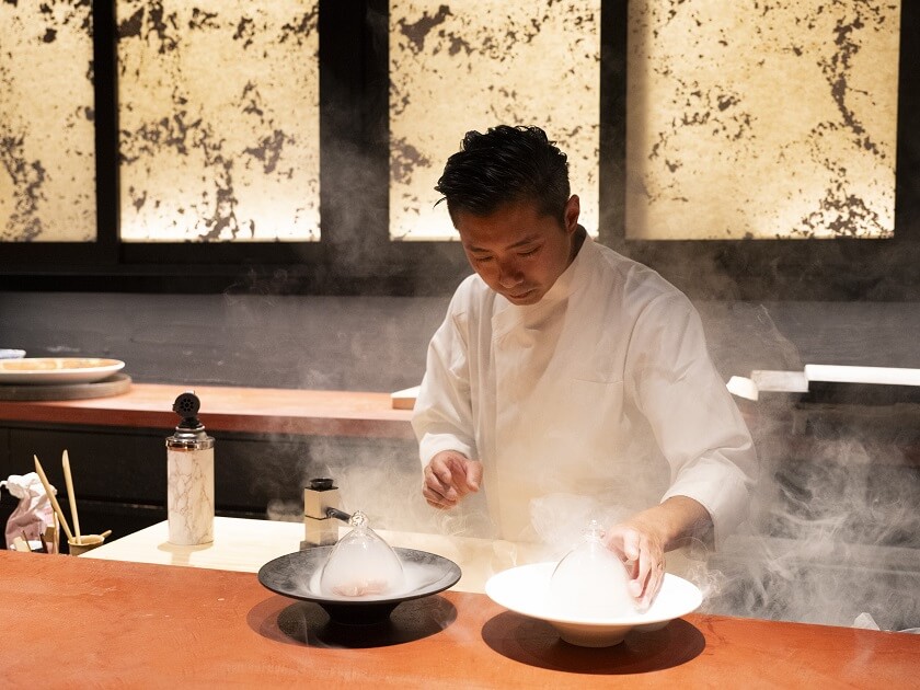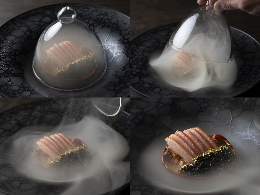 蟹の甲羅をコーティングして作ったオリジナルの器に適度に火を通した身、内子、外子を詰め、その上にゆでて氷水で急冷した脚を美しく並べます。たっぷりと添えるのはキャビア。トライアンドエラーを重ねて相性を見極めた、蟹と高級食材の極上の組み合わせです。金箔を散らしたら、仕上げにガラスのカバーで桜のチップの煙と共に閉じ込めて、優しくおだやかな香りをまとわせます。お客様自身がゆっくりと回すようにしながらカバーを外すと、雲海のような景色の中に料理が姿を見せるという仕掛け。この演出と、燻香とフレッシュな素材の味が織りなすストーリーが相まって、お店が目指す感動を呼ぶ食体験が完成します。