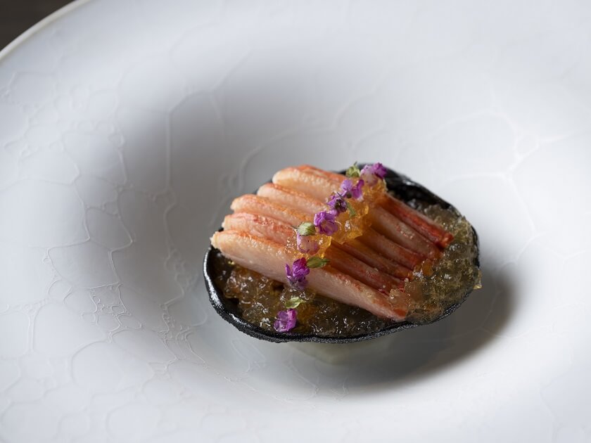 長島氏から学んだ日本料理の精神と技を基本に、これまでのキャリアで得たものや日々の中でのひらめき、新しい知見を、蟹料理へと昇華させている岡田さん。その1つとして誕生したのが、今回キラーメニューとして紹介する「香箱蟹キャビアの冷燻」です。蟹の中でも熱心なファンが多い香箱蟹。その期待を裏切らず、想像を超えたメニューにしたいという想いを込めた逸品です。