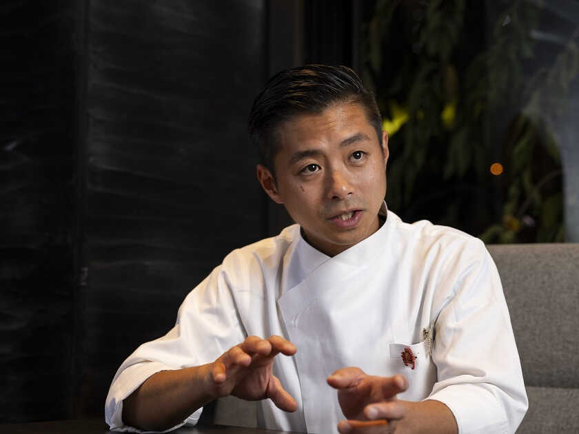 お客様の目の前で調理から盛りつけまでを行うことで、その音や香り、熱量を感じてもらい、配色や配置、器にこだわることで料理を目でも堪能してもらいます。堅苦しい雰囲気では食事を心から楽しめないため、ゆったりとくつろげるおもてなしにも注力。このような五感を刺激する食体験の実現に向けて、哲学やデザイン論、色彩学といったありとあらゆる知識をフル活用し、スタッフとのブレインストーミングやマインドマップといった手法も取り入れながら、「かにかとう」ならではの革新的かつ独創的な料理とホッとできるサービスを、ロジカルに構築しています。
