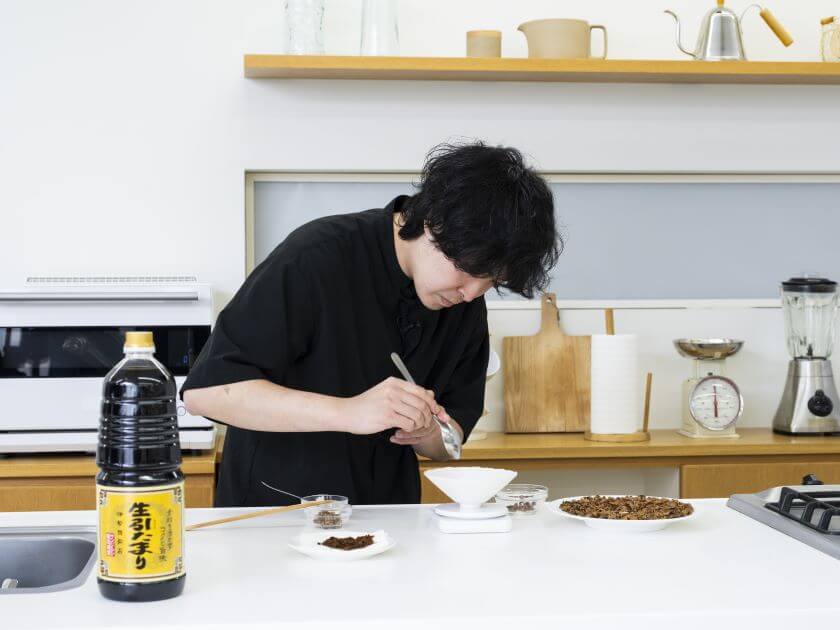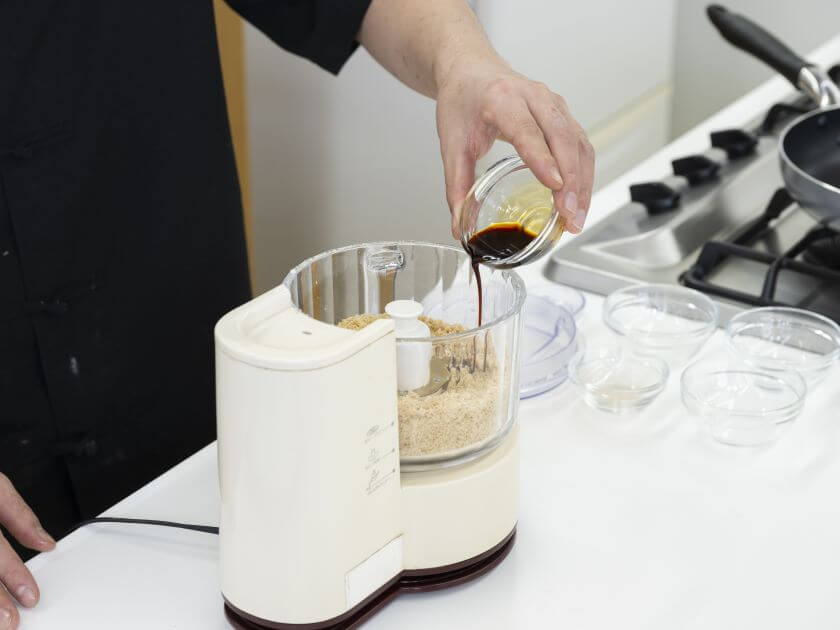 醤油は、甘さやまろやかさがあり、バターなどの乳製品や今回使った八角などのスパイスと親和性が高い「生引たまり」を選び、シュトロイゼル(粒状のトッピング)に仕立てました。醤油以外の材料をフードプロセッサーにかけて均一に混ぜ、最後に醤油を加えると、香りをしっかりと活かせます。