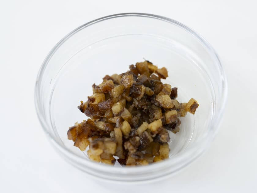 燻製猪にも醤油を使います。猪肉から取り分けた脂を、ブナの実の殻と砂糖を合わせたもので燻し、小さくカットしたら煮詰めた「生引たまり」と絡めて甘い香りをまとわせます。この香りで、私の好きな台湾の屋台料理のようなニュアンスが加わるんですよ。猪脂やブナの実の殻は調理の過程で生じる副産物ですが、このようなものを上手に使っていきたいです。