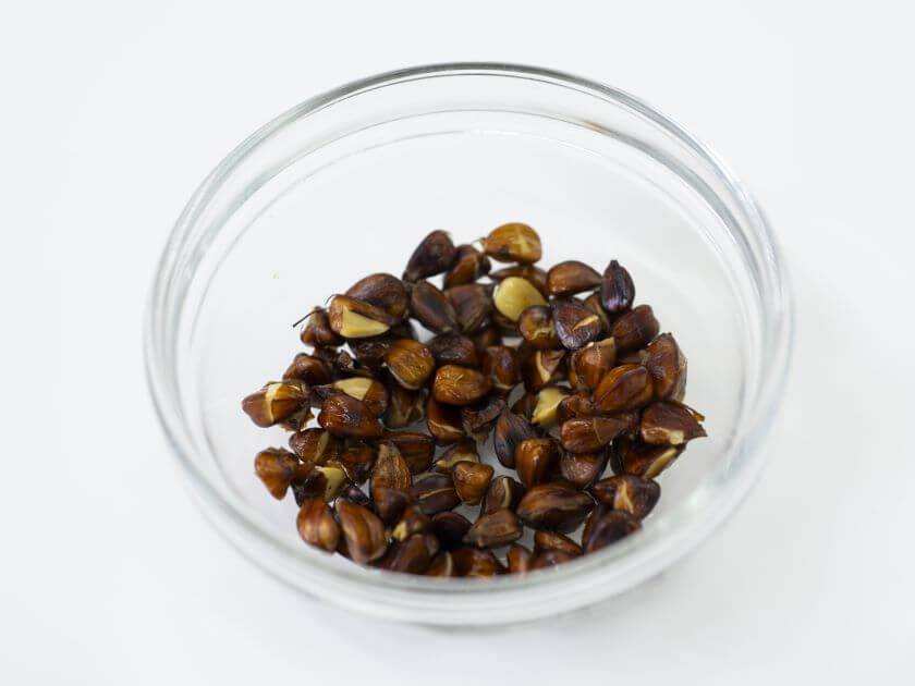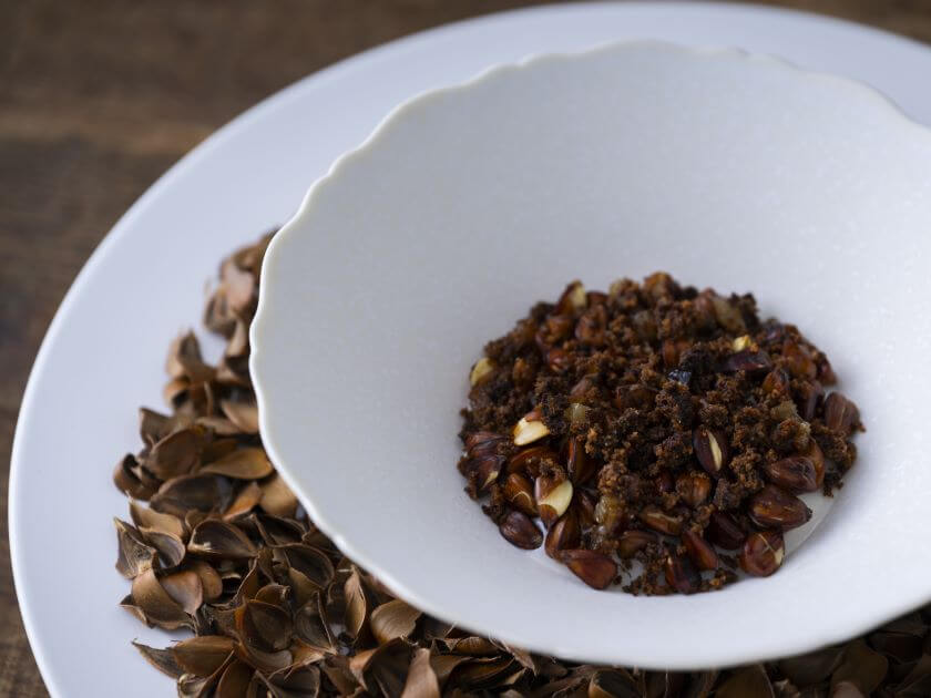 醤油と共に料理の主役に決めたのが、ブナの実です。あまりなじみのない食材かもしれませんが、日本では昔から食べられてきたナッツで、森や大地をイメージさせる風味やしっかりとした旨味、油分があります。今回のメニューでは、ブナの実をソテーとペーストに使うことにしました。ソテーでは、ブナの実をオリーブオイルで少し色が変わって香りが出るまで炒めますが、中火で火を通すようにし、焦がさないように注意しましょう。ペーストは、乾煎りして薄皮をむいたブナの実をミキサーにかけて作ります。