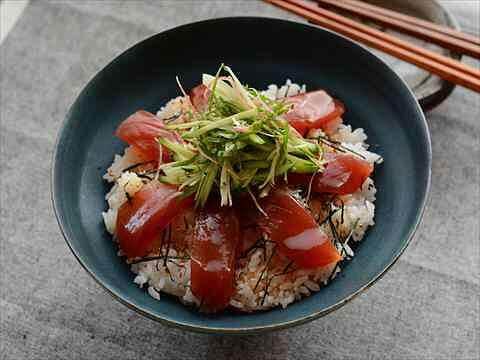 カロリー控えめでヘルシーなまぐろの赤身を使い、薬味野菜を彩りよく合わせた、ちょっぴり豪華なちらし寿司。まぐろは「ヤマサ 鮮度生活 北海道昆布しょうゆ 塩分カット 300ml」につけ込んで味わいのある仕上がりに。