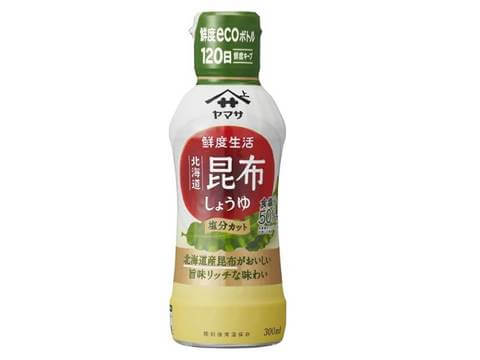 「ヤマサ 鮮度生活 北海道昆布しょうゆ 塩分カット 300ml」は、本醸造しょうゆに北海道産昆布だしを加え、食塩分を普通のこいくちしょうゆと比較して50%までカット(塩分7.7g/100g当り)。化学調味料無添加で、昆布だしの旨みを効かせました。減塩しょうゆ並みの塩分ですが、味に物足りなさを感じることはなく、様々なメニューにお使いいただけます。