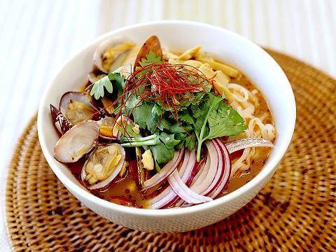 「ヤマサ スパイシーエスニック醤」で、寒い季節にも嬉しいあったかメニュー。あさりのうま味と牛乳のまろやかな味わいの、マイルドなトムヤムフォーです。