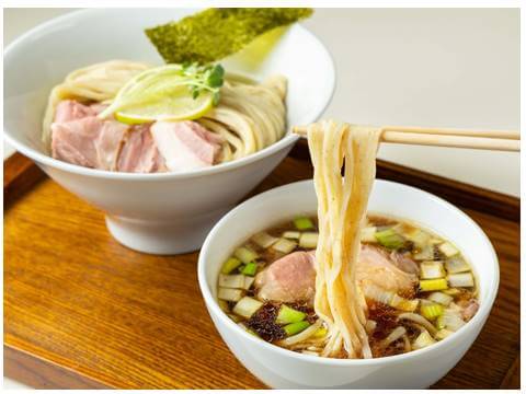 栃木県小山市に店舗を構える大人気ラーメン店『ヨコクラストアハウス』は、2024年秋に開催された“大つけ麺博つけ麺日本一決定戦“で優勝をし、この「昆布水つけ麺」の流行を生み出しました。流れるように器に麺を盛り、ライム・山椒の実を添えた美しい盛り付けが特長です。