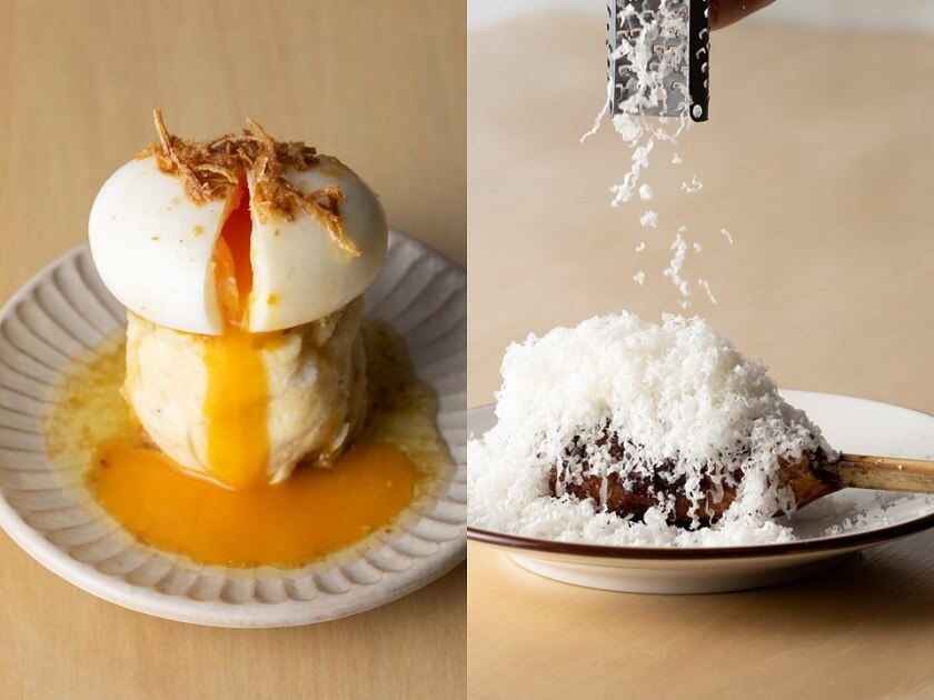 お客様の約8割が注文するのが、キラーメニューの「ポテタマ」です。「パルミジャーノつくね」など美味しさと新しさを両立させた料理を生み出してきた泉さんのお店のポテトサラダを、「酒羅場」ではお客様自身が半熟卵を割るようにアレンジして提供しています。そのエンターテインメント性や卵の黄身がトロリと流れ出る様子がウケて、動画をインスタグラムにアップするお客様が続出しました。「お客様のSNSが思いがけない宣伝となりました」と小林さん。なめらかなマッシュポテトに素揚げした角切りのじゃがいもを加え、『ヤマサしょうゆ』や粒マスタードなどで作ったオリジナルドレッシングとフライドオニオンでアクセントをつけた、食感にも味わいにもひねりのある一皿です。