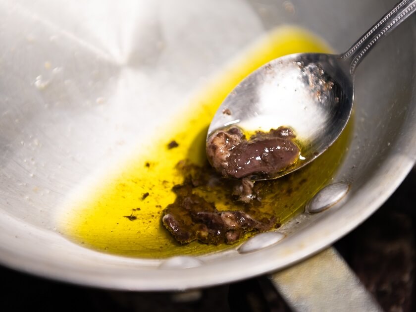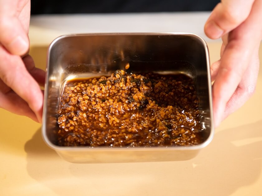 肝は、醤油麹とタプナードと混ぜ合わせて「肝のタプナードソース」にします。“ほろ苦い”肝ですが、実は旨味もしっかりあるんです。その旨味は、オリーブオイルで丁寧に火を入れる前工程で引き出されます。醤油麹とタプナードの割合は、塩味の加減を気にしながらお好みで。タプナードには、アンチョビの代わりに日本伝統の魚醤「いしる」を使うのも面白いと思います。