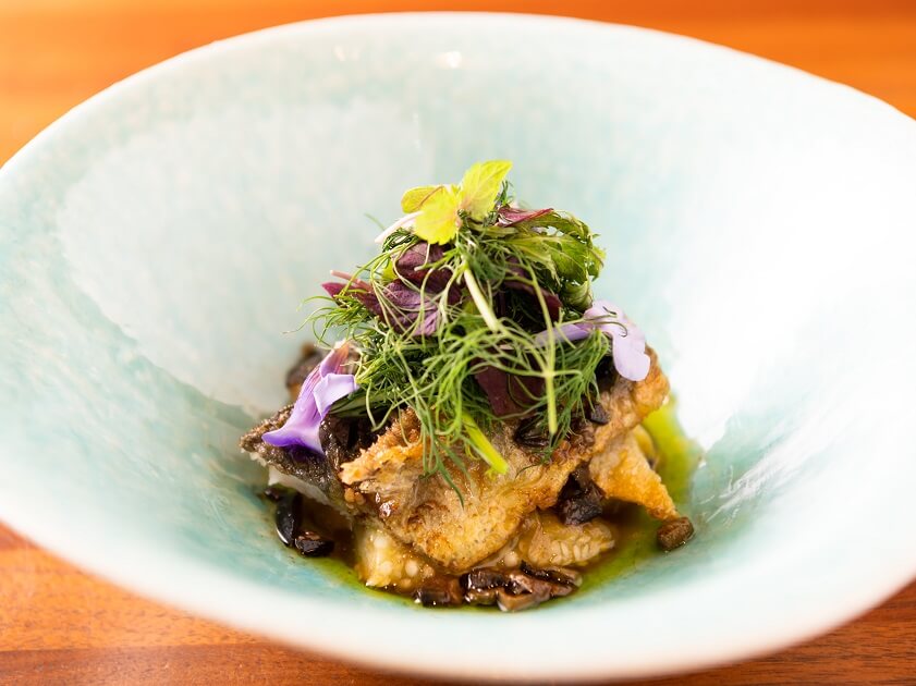 付け合わせの揚げ茄子は、「ヤマサ重ね仕込しょうゆ 本懐石」で塩味と香りをつけたブイヨンに浸します。茄子は夏から秋にかけて旬を迎えるので、鮎との相性もぴったりです。鮎のポワレと揚げ茄子、鮎の中骨を素揚げした骨せんべいを重ね、肝のタプナードソースとハーブを盛り付ければ完成です。