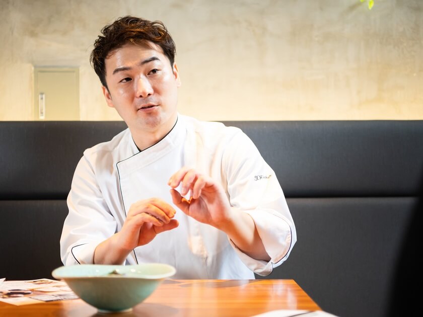 今回は鮎を使いましたが、サンマやイワシなど、肝に存在感のある魚でもアレンジできます。普段何気なく食べたり調理したりしている魚でも、味、香り、食感、それぞれに固有の魅力があります。フランス料理人として私が大事にしているのは、食材の光る要素を見つけ出し、技法と感性を駆使して食べる人に伝えることです。そんな私なりの意気込みを、「鮎のポワレ 醤油麹と肝のソース」のおいしさとともに感じていただければ幸いです。