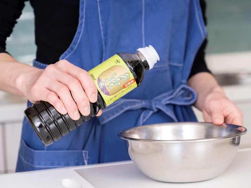 「ヤマサしょうゆ」は大豆の香りが豊かでクセがなく、エビの風味を邪魔しないことから使用を決めました。また、「ヤマサ あおさしょうゆ」はあおさの旨味が同じ海産物であるエビに合うことと、今回のテーマであるお茶は旨味が強いため、だし醤油と相性がよいと思い選んでいます。
