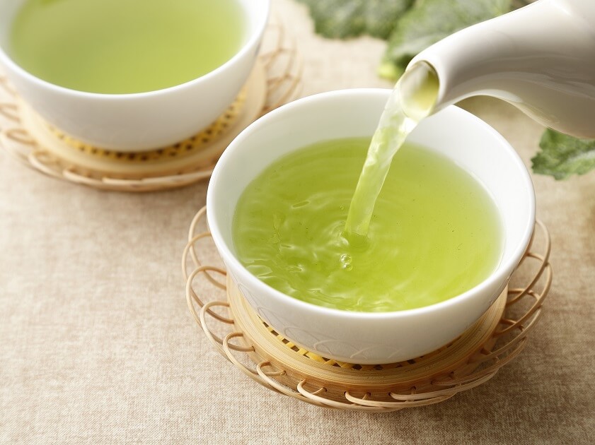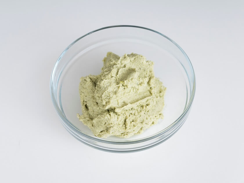 緑茶のムースづくりは、80度に沸かしたお湯に玉露の茶葉を入れ、蓋をして5分ほど蒸らすことから始めます。低温でじっくり蒸らすことで旨味と香りをしっかりと抽出したお茶を濾し、水を加えて100gにします。この時、旨味や香りと一緒に色まで抽出しようとすると、お茶に苦味が出てしまいます。ムースにお茶の色を付けるためには茶殻が役立ちますので、濾し取った茶殻を残しておきましょう。次に新玉ねぎを甘味が出るまでバターで炒め、100gにしたお茶と残しておいた茶殻5gを加えて煮込むことで味や香り、色を移し、板ゼラチンを入れて溶けたらミキサーで攪拌します。冷え固まったら生クリームと合わせ塩コショウで味を整えてムースは完成です。