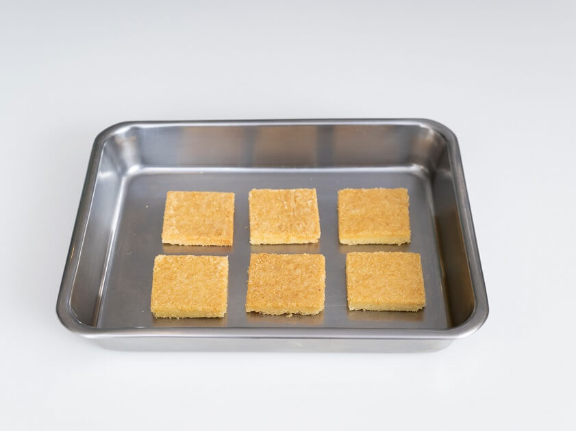 次にチーズタルトをつくります。バター、塩、粉砂糖をなめらかなホイップになるまで混ぜ、卵黄を少しずつ加えて乳化させます。そこに濾した小麦粉などの粉類とパルミジャーノの粉を加え、さっくりと混ぜた状態で冷蔵庫に移して休ませた後、4~5mmの厚さに伸ばして焼き、一口サイズにカットします。